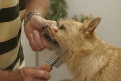 Bevor Sie mit dem Trimmen beginnen, kämmen Sie den Hund mit einer Drahtbürste oder einem Kamm gründlich durch. In Wuchsrichtung des Haares zupfen Sie mit einem scharfen Ruck das Deckhaar mit dem Daumen und dem Zeigefinger heraus.