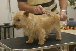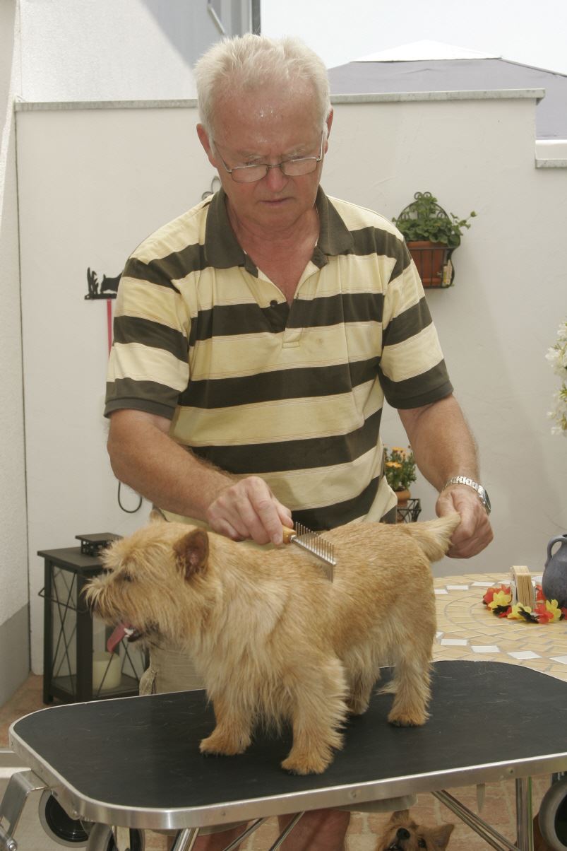 Aber auch, wenn Sie Ihren Norwich Terrier lange im "rollling coat" halten können, werden Sie nicht umhin kommen, ihn einmal komplett abtrimmen zu müssen. Denn irgendwann ist kein geschlossenes Deckhaar mehr vorhanden, der Hund hat Löcher im dünnen Deckhaar, und das sieht nicht besonders schön aus.