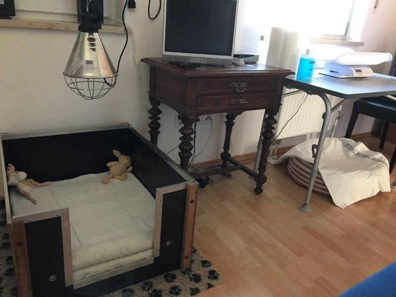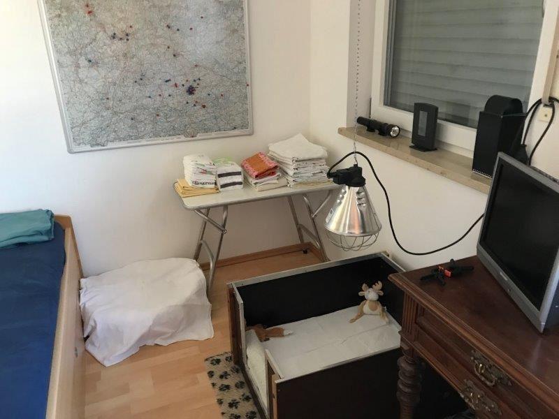 Das ist unser Gästezimmer im ersten Stock, das während der Welpenzeit als Wurfzimmer zweckentfremdet wird (oder ist es umgekehrt?). Das kleine Zimmer eignet sich ideal. Auf der Nordseite des Hauses gelegen bleibt es im Sommer relativ kühl, im Winter ist es schnell geheizt und auch wieder gelüftet. Unsere Hündinnen genießen es, die erste Zeit mit ihren Welpen dort in Geborgenheit und ganz ungestört zu sein. Während der ersten Wochen schlafe ich ebenfalls in diesem Zimmer.